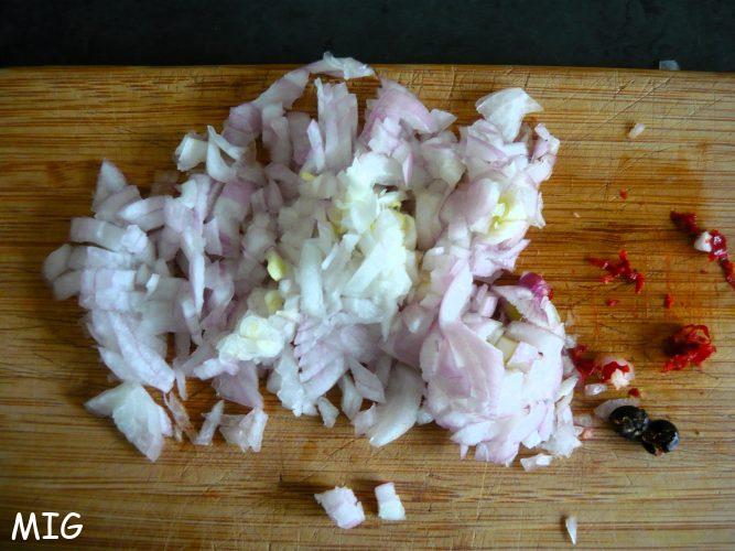 Epluchez et hachez finement l’oignon et le piment rouge sans ses graines, écrasez les baies de genièvre.