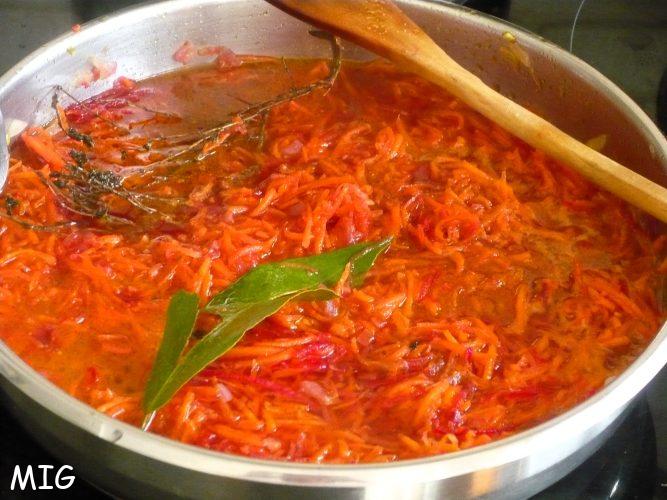 Faites chauffer l’huile dans une casserole pour y faire revenir les baies de genièvre pendant une minute, puis les oignons pendant dix minutes avant d’ajouter le piment, le thym, le laurier, les carottes et betteraves.