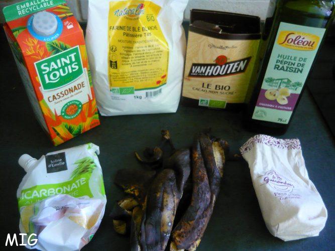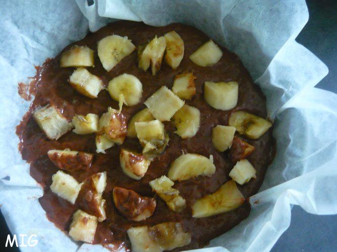 L’association chocolat-banane, j’adore, et,  comme j’avais envie d’un gâteau au chocolat un jour où je n’avais plus d’oeufs, souvent remplacés par les bananes dans de nombreuses recettes et que j’en avais justement en bout de course, c’était le moment parfait pour bricoler un dessert.