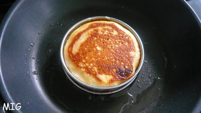 Faites chauffer un peu de beurre ou d’huile neutre dans une poêle anti-adhésive (je démarre à feu un peu vif 6/10 puis réduit à 4 ou 5, la préparation est épaisse, il faut que les blini cuisent sans brûler) puis versez un peu de pâte. Lorsque des bulles apparaissent à la surface, c’est que vous pouvez les retourner. Pour des blini de taille régulière, j’ai utilisé des petits cercles à pâtisserie préalablement beurrés (ça marche aussi pour les pancakes).