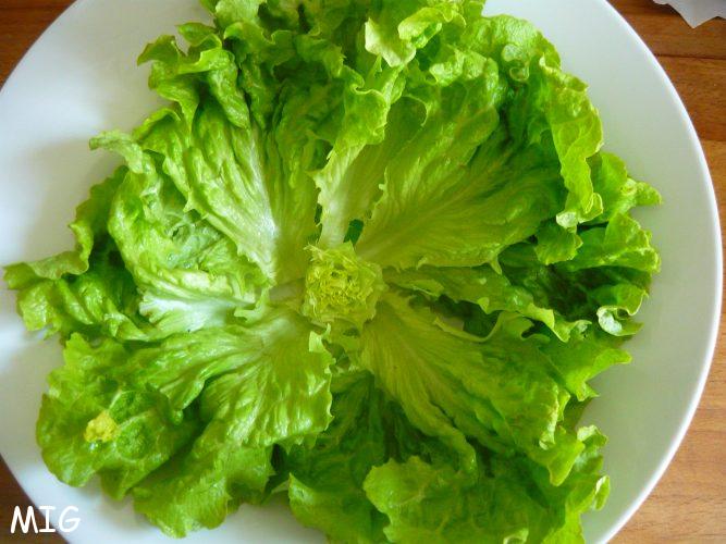 Laver la salade sans couper totalement le trognon, juste quelque millimètres pour qu’il soit propre, ôter le coeur, vous l’utiliserez une autre fois, la mettre dans une assiette, bien à plat.
