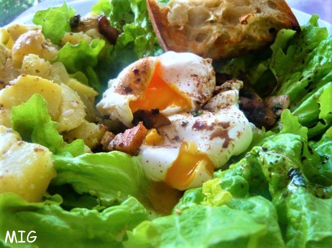 Disposer ce mélange au centre de la salade. J’ai mis les pommes de terre vinaigrette sur le coté, on peut les poser sur le mélange champignons lardons (oui au dessous aussi…).
