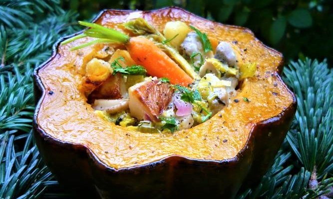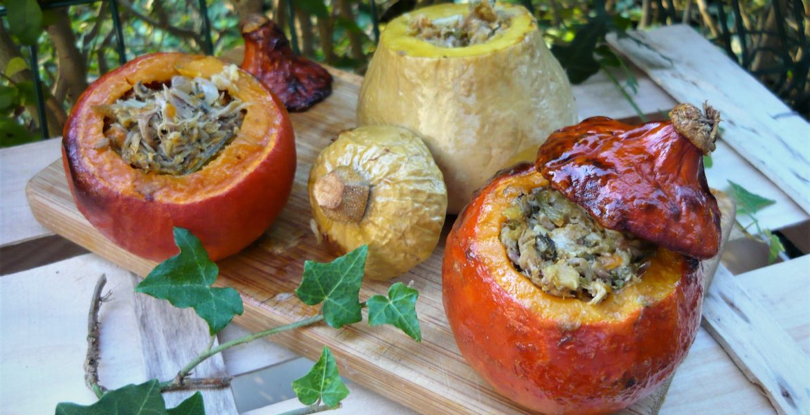 Un reste de viande, des mini potimarrons (et/ou doubeurres ; je trouve plus poétique et gourmand le nom français que l’anglais butternut), un petit tour au four, et voilà une recette facile qui plaira à tous, à adapter selon vos restes de viande.