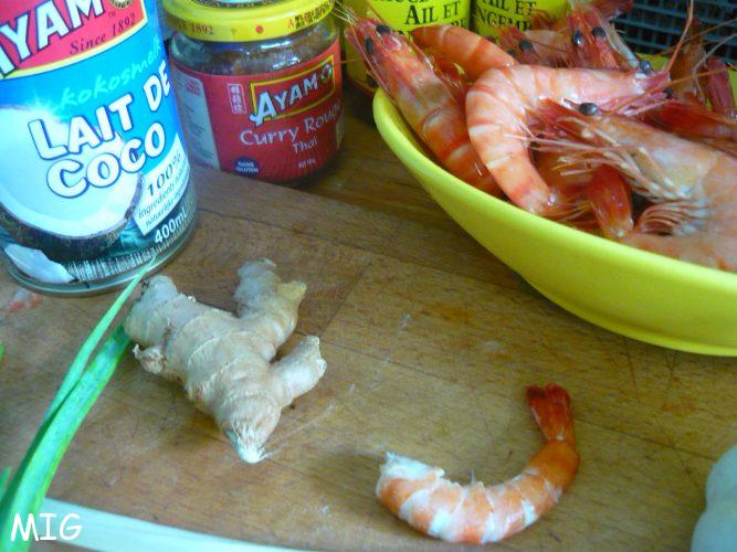Faites chauffer l’huile dans une poêle et y faire revenir l’oignon, la citronnelle, l’ail, le gingembre, le piment et les cacahuètes. Au bout de quelques minutes incorporez au mélange lait de coco/pâte de curry rouge