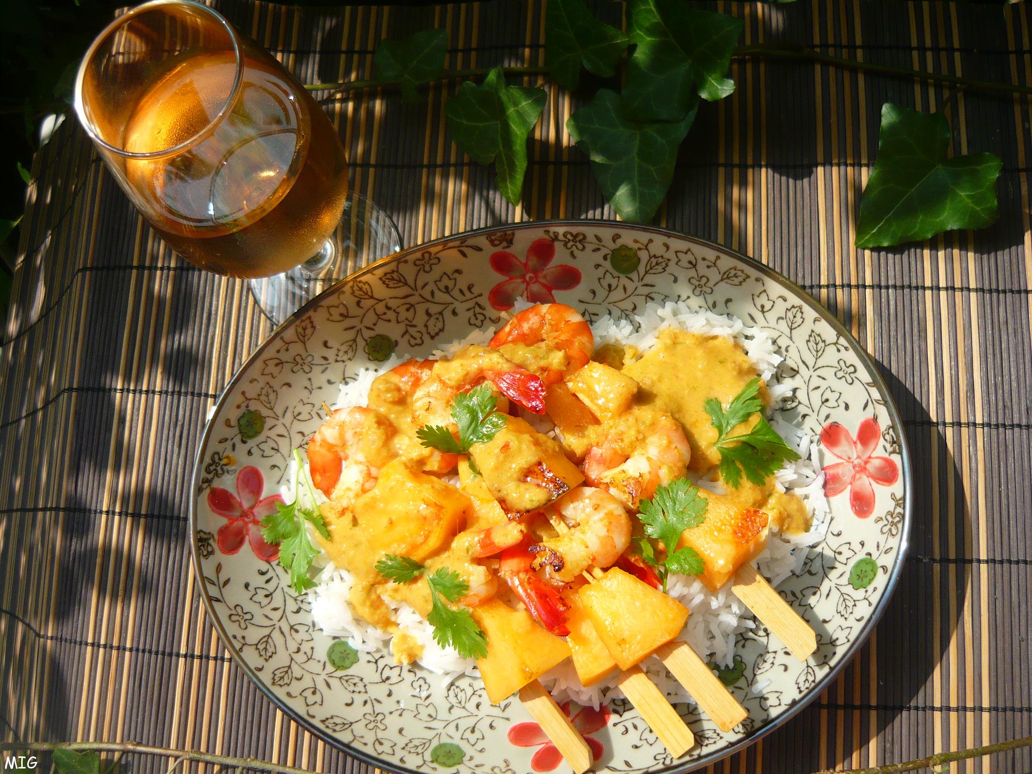 Posez les brochettes sur le riz, nappez de sauce, parsemez de quelques feuilles de coriandre. S’accorde parfaitement avec un bon Sancerre Rosé frais, avec modération.