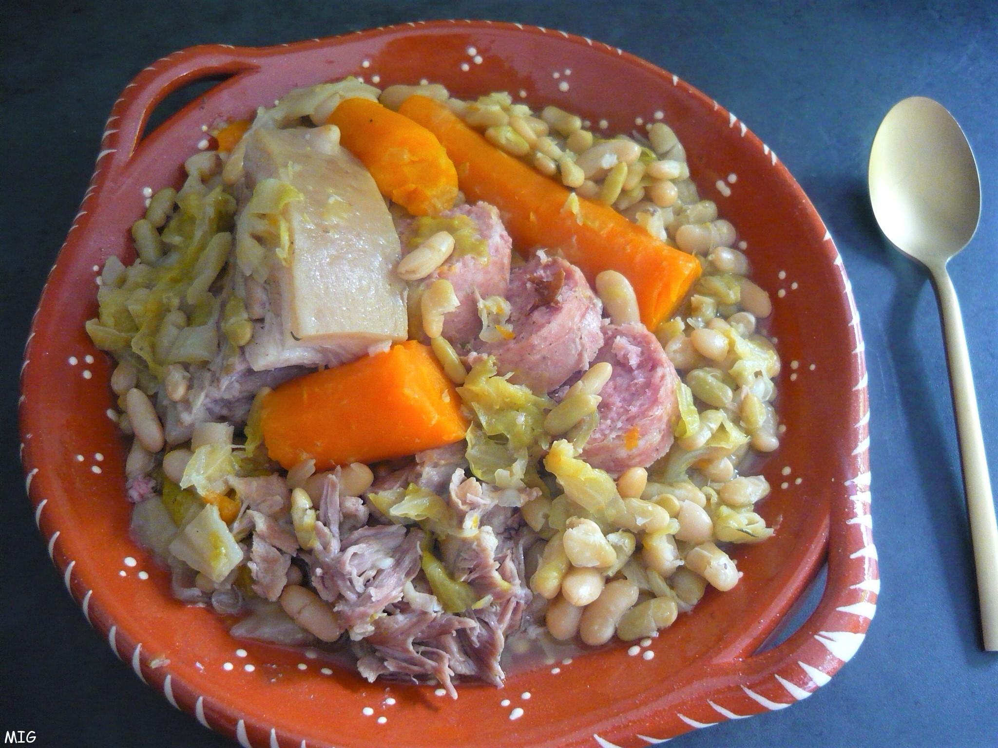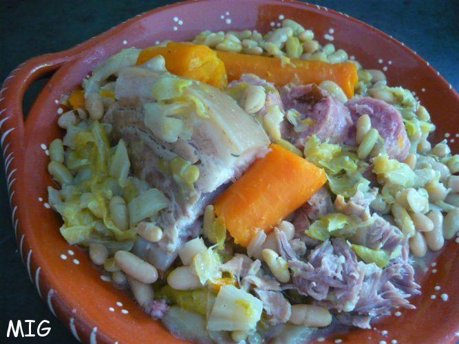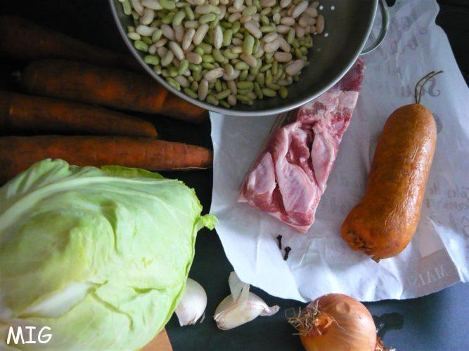 Au bout d’une demi-heure, dans une autre casserole, recouvrez les haricots, l’ail, le thym et le laurier d’eau froide, portez à ébullition et laissez cuire, à feu couvert, pendant une demi-heure puis versez-les dans la cocotte où la viande mijote (depuis une heure donc), avec leur eau de cuisson, l’ail, le thym et le laurier. Ajoutez les carottes, le chou et prolongez la cuisson, à feu couvert, pendant encore une heure en ajoutant le saucisson à mi-cuisson.