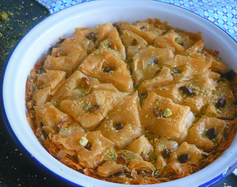 Comme il me restait de la pâte filo, d’un dessert à la feta, que j’adore les Baklava à la Pistache et que j’avais tout le reste des ingrédients, j’en ai fait un…